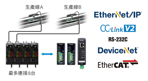 為了同時收集並輸出目標(biāo)物的靜電量及周圍的溫濕度資料,感測器標(biāo)準(zhǔn)配備獨立的三通道判斷輸出,以及類比電壓與電流輸出功能。此外,透過搭配通訊模組,可整合傳送主模組與擴充模組所連接的最多八臺設(shè)備的資料。亦可由PC或PLC端讀取資料與修改設(shè)定值,進一步大幅縮短工時、提升作業(yè)效率。