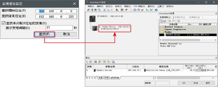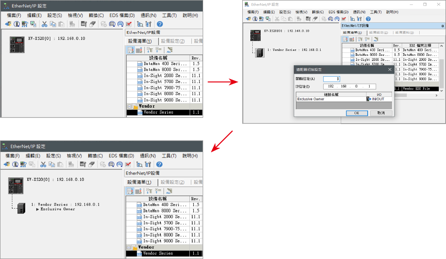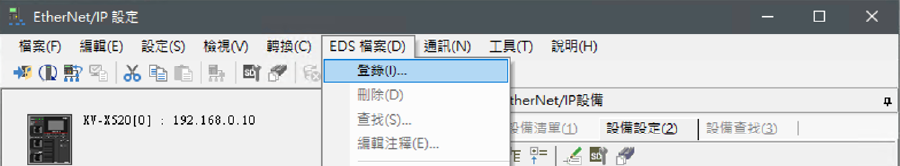 - 手動(dòng)設(shè)置設(shè)備配置的方法 在“EtherNet/IP 設(shè)定”的 [設(shè)備清單 (1)] 選項(xiàng)卡中,拖放“Vender Series”並創(chuàng)建設(shè)備配置。
