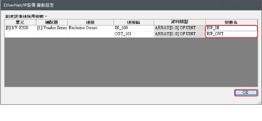 當(dāng)選中“更新 EtherNet/IP 設(shè)置 (E) 時(shí)顯示“變數(shù)設(shè)置”對(duì)話框”時(shí),將顯示 [EtherNet/IP 設(shè)備變數(shù)設(shè)定] 對(duì)話框。 輸入分配給連接的變數(shù)名稱,然後按下 [OK]。