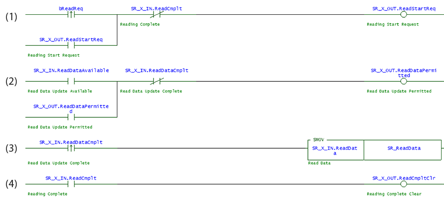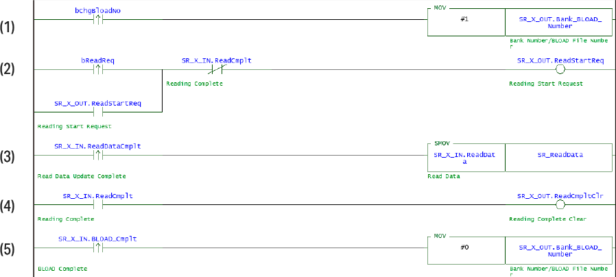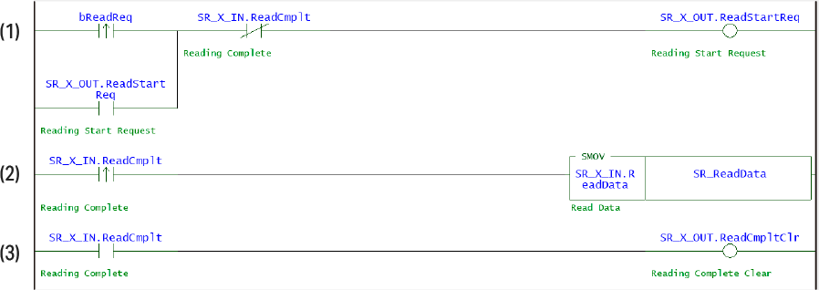 在此程式範(fàn)例中,使用下列 SR-X 系列 裝置指定,讀碼器會(huì)被指示以 1 號(hào)庫的設(shè)定開始讀取,讀取字串會(huì)儲(chǔ)存在 SR_ReadData 中。
